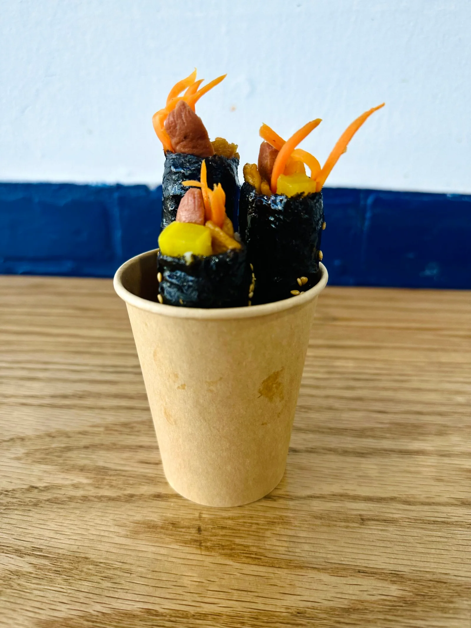 Packed with sausage, crab, fish cake, crunchy radish, and a kick of spicy sauce, our mini gimbap is wrapped in seaweed and sprinkled with sesame for the perfect bite