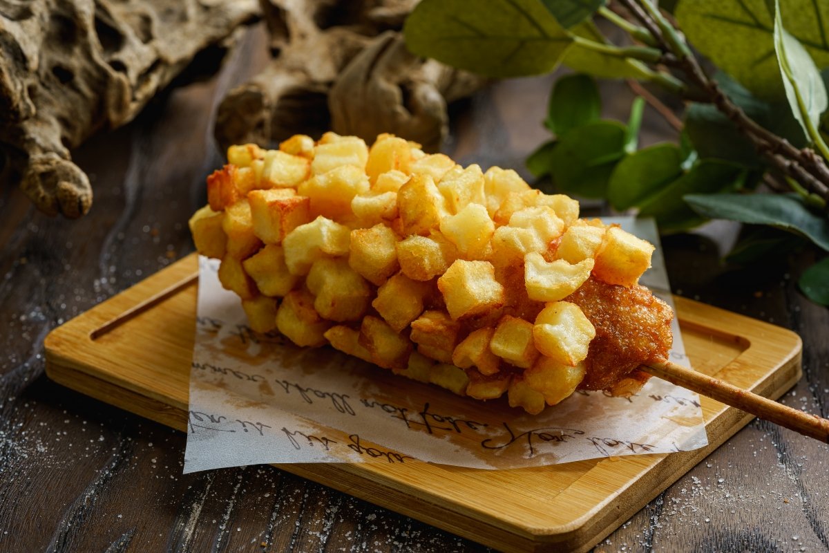 Experience extra crunch with our corndog, covered in crispy potato chunks that enhance the savory flavor with every bite.