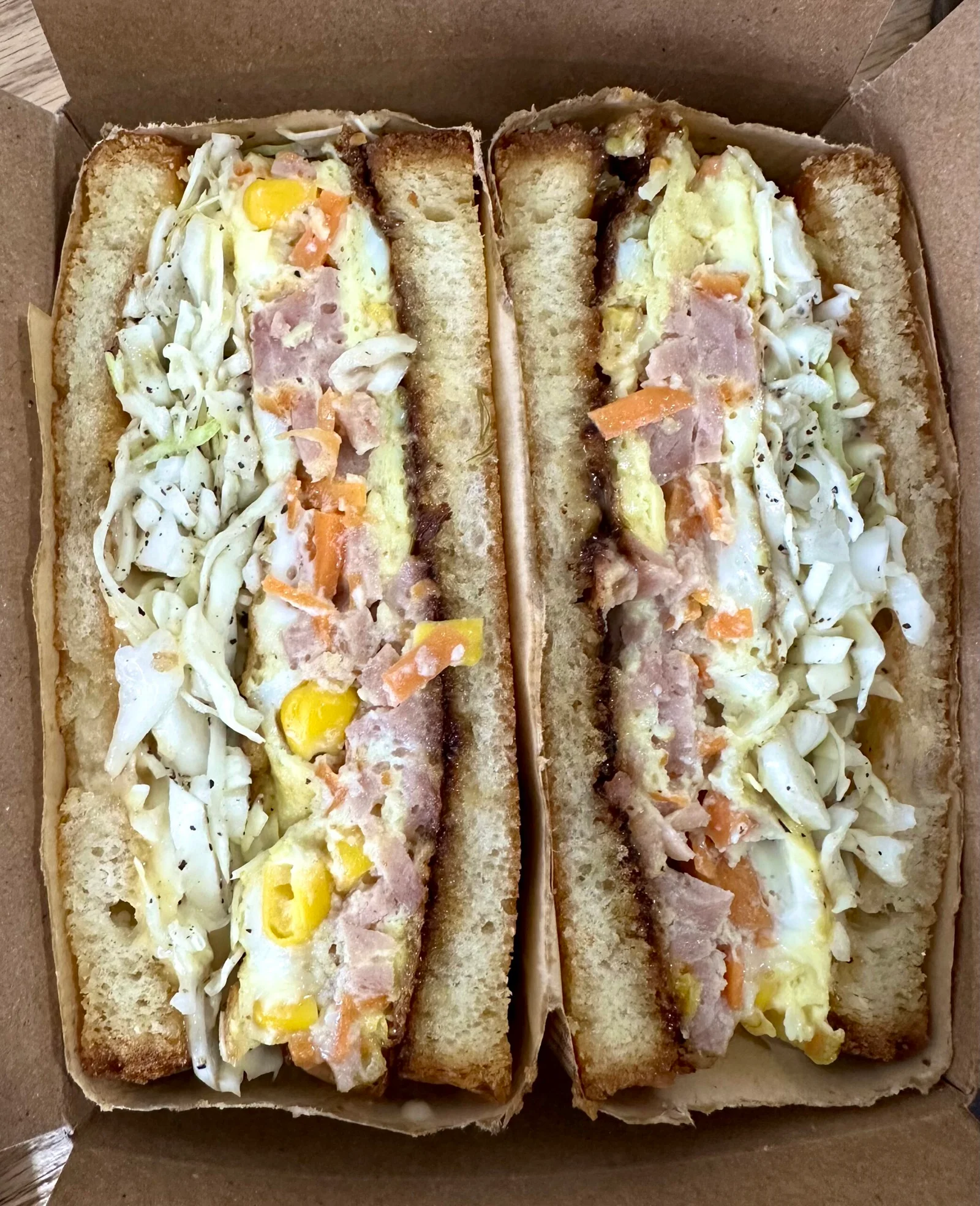 A perfect blend of savory spam, fluffy eggs, melted cheese, and sweet sesame slaw with pineapple and carrots, all wrapped in honey-buttered toast.